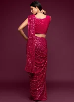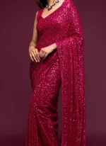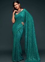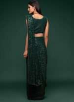 Make the heads turn whenever you dress up in this dark green color georgette saree. This saree is displaying some wonderful work done with embroidered and sequins work look chic. This saree comes with unstiched dark green color georgette blouse.