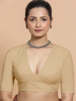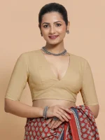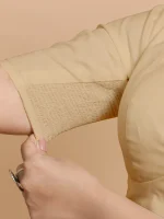 Navya x Tyohaar | Cream Elbow Sleeves FlexiFi Saree Blouse with Plunging V Neckline with Tasteful Golden Gota Lace ₹3,000.00 Original price was: ₹3,000.00.₹2,500.00Current price is: ₹2,500.00.