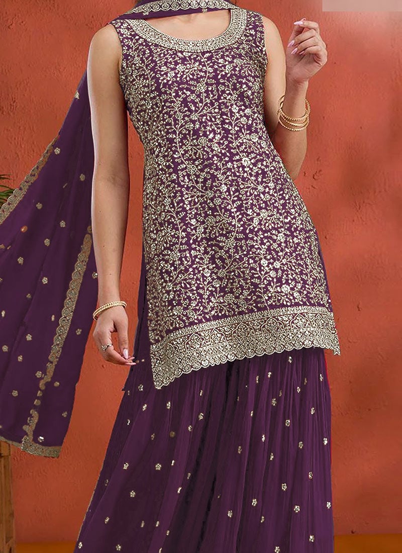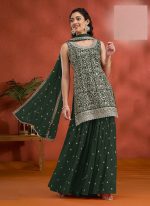- This green georgette palazzo set embodies elegant charm and festive sophistication with intricate embroidery and sparkling sequin work. The rich shade of green brings a refreshing touch of grace perfect for celebrations and traditional gatherings.