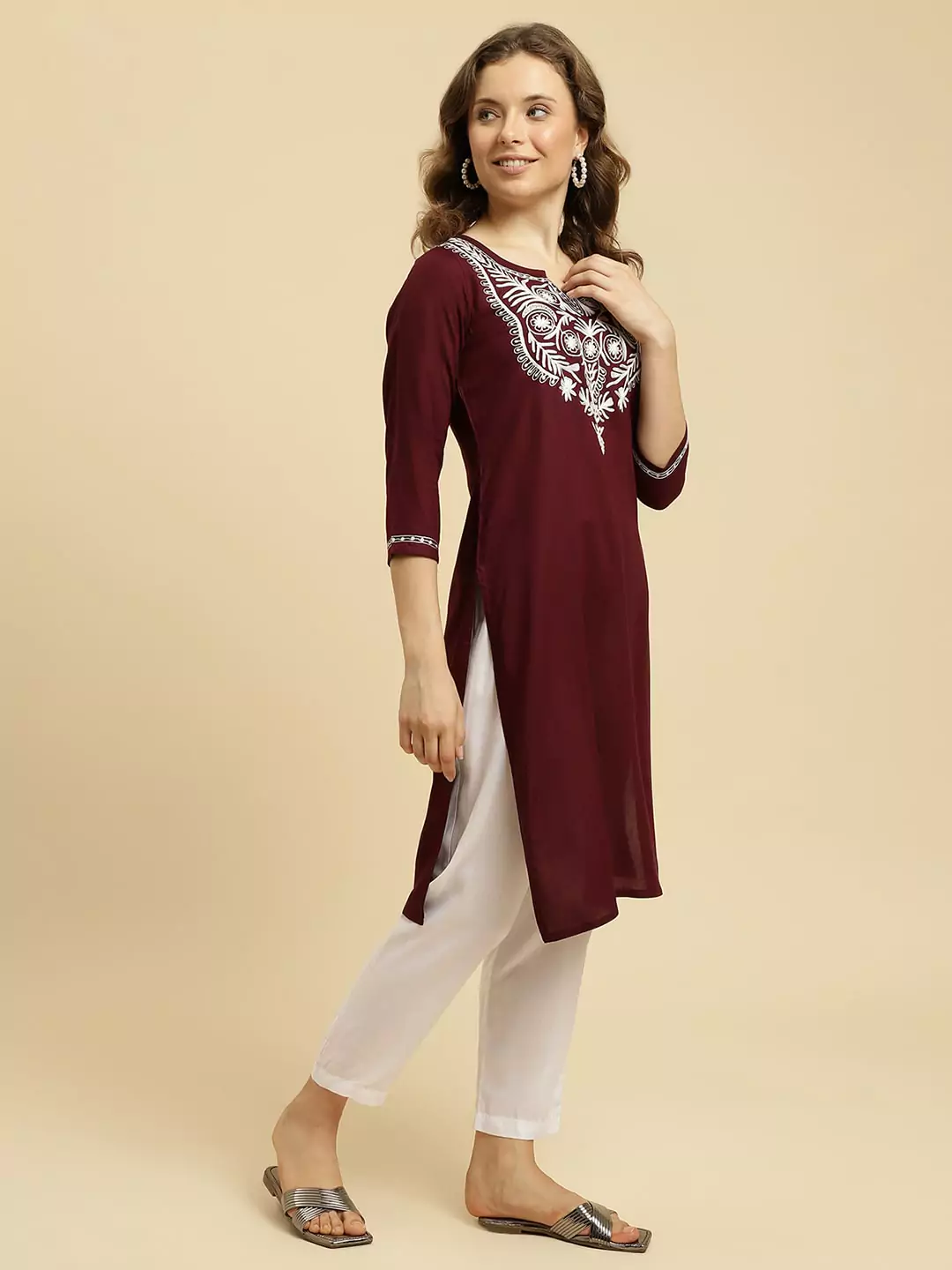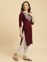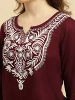 Home Kurtis Long Kurtis Wine Silk Embroidered Kashmiri Kurti